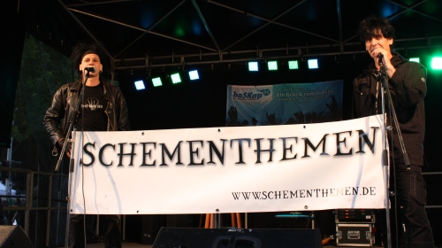Besonders in Erinnerung blieb die Lesung der Schementhemen. Myk Jung und Klaus Märkert waren bereits im zweiten Jahr in Folge auf der Wortschatz-Bühne. Ihrem klassischen Punk-Look blieben sie treu. Ihre Geschichten sind meist alltägliche Situationen, die sich skurril weiterentwickeln. „Mag jemand Möpse?“, fragt Märkert provozierend. „Also die Hunde… das geht in der Geschichte nämlich nicht gut aus für die.“ Der Plan, um 10 Uhr schnell eine Runde mit dem Hund spazieren zu gehen, wird bei der Schementhemen-Story für einen Hundebesitzer genauso schnell zum handfesten Problem: Sein Hund reißt eine zu tief fliegende Wildgans. Prompt folgt die Anfeindung eines Walkers, der gerade seine Meter macht. Es entbrennt ein Streit über das gebissene Tier, der in peinlichen Euthanasieversuchen endet. Die Schementhemen bleiben ihrer düsteren Tonart des Humors treu.