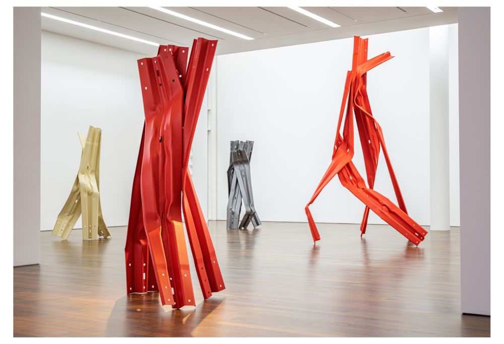 Kongenial dazu ist im Stockwerk darunter das Werk vonBettina Pousttchi (*1971) ausgestellt. Ihre Skulpturen wirken zunächst ganz anders, schon weil sie ungegenständlich sind. Pousttchi nimmt Baumschutzbügel oder Leitplanken aus dem normierten Stadtraum. Sie richtet sie auf, deformiert sie und dreht sie teils umeinander und überzieht sie homogen mit Farbe. In Rolandseck hängen außerdem Reliefs, die Verkehrspfeile umformen und nun mit ihren organischen Verläufen Hans Arp zitieren. Faszinierender ist der diskursive Bezug der allansichtigen Skulpturen zum filmisch Narrativen im Werk von Stella Hamberg: Was Hamberg mit der Figur vollzieht, unternimmt Pousttchi im Ungegenständlichen – schon wie sich ihre Skulpturengruppen tänzerisch aufeinander beziehen, die Glieder einknicken und zerbrechlich wirken. Mag sein, dass dieses Durchspielen von Bewegung bei ihr langatmig wird, aber dann ist noch ihr „Double Monument for Flavin and Tatlin VII“ (2010) ausgestellt, das wie eine Verschmelzung der besten Eigenschaften ihres Werkes wirkt. Übrigens steht eine ihrer Figuren am weitläufigen Skulpturenufer Remagen: Dort geht es mit dem anregenden Einblick in die zeitgenössische Skulptur weiter.