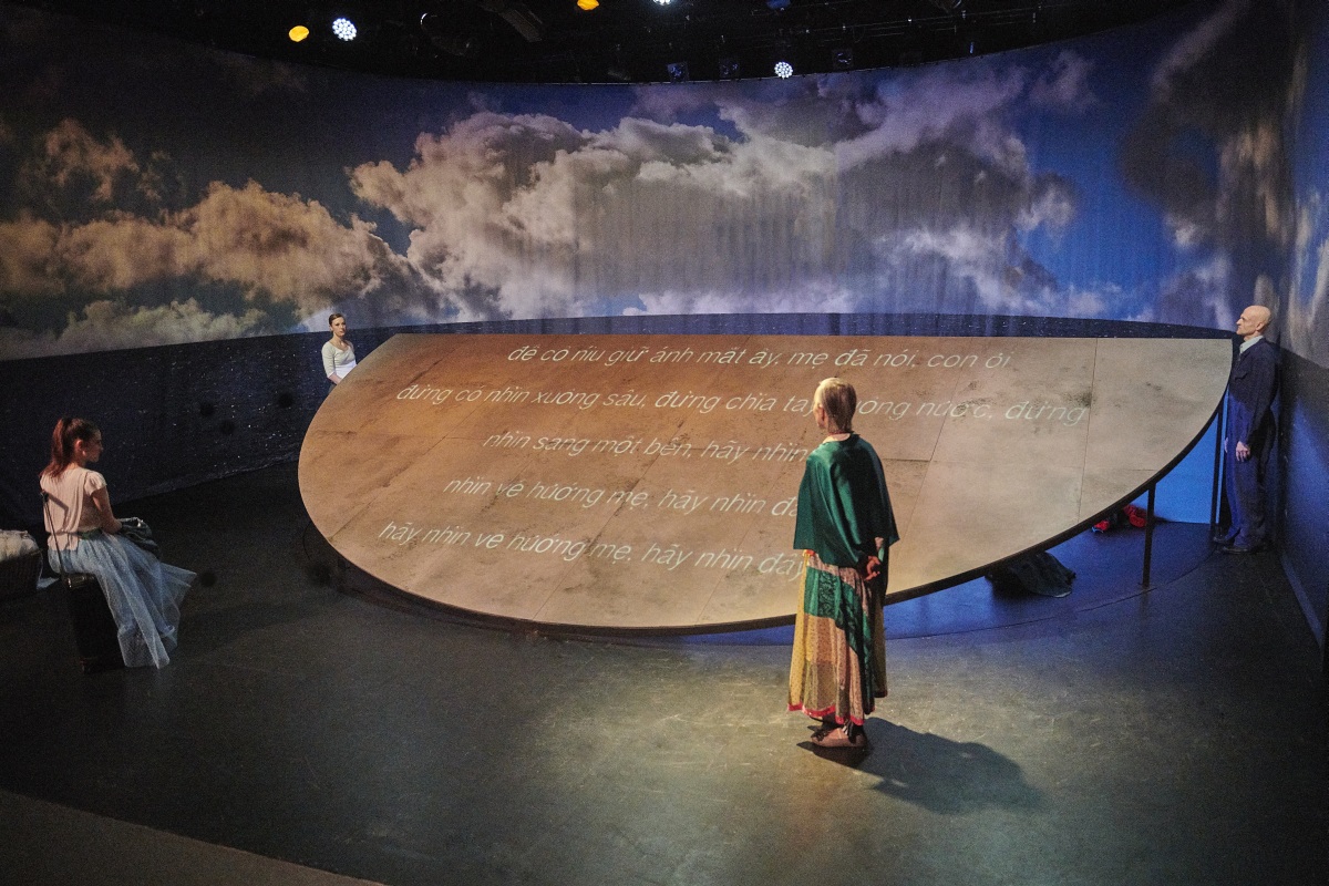 All das schießt dem Wissenden nach und nach wieder durch den Kopf, wenn man aufmerksam dem Text des österreichischen Autors Thomas Köck – der für „Atlas“ im letzten Jahr den renommierten Mülheimer Dramatiker-Preis erhielt – folgt und sich das anfangs verwirrende Personenpuzzle entschlüsseln lässt. Genau dies macht Regisseurin Jenke Nordalm in ihrer Inszenierung, unprätentiös, mit Himmels-Panoramawand, einer Nähmaschine als ostdeutsches Werkbank-Requisit und einer drehbaren schiefen Ebene, auf der die Geschichte am Ende immer die Zeit in eine Ordnung bringen soll, weil die Zeit das alleine nie hinbekommt und eigentlich immer die Falschen über Geschichte entscheiden. Denn alles scheint mit allem verwoben, auch die alte Großmutter in Vietnam mit beiden deutschen Staaten, in denen sie nicht bleiben wollte, in denen aber unbemerkt die für tot gehaltene Tochter und ihre Enkelin zahlreiche Wurzeln haben. Die Enkelin kommt nach Saigon während der Eyjafjallajökull Asche über die Welt schickt auf der Suche nach ihren Wurzeln und findet sie in einer Frau, die sich weigert, die Tatsachen nach so langer Zeit anzunehmen. Ein verblichenes Foto ist die einzige mögliche Beweislage, die beide zu verbinden scheint, doch die alte Frau will, durch Umerziehungslager des Việt cộng und jahrelange Fronarbeit gegangen, die Zeit nicht mehr in eine richtige Ordnung bringen und so bleibt das Ende wissend und bewusst offen.