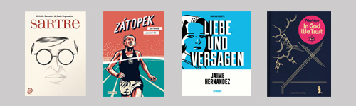 Mathilde Ramadier und Anaïs Depommier erzählen von „Sartre“. Es ist wohl nicht die leichteste Aufgabe, einen Denker dieses Kalibers grafisch zu porträtieren. Gestalterisch und erzählerisch halten sie sich an einen konventionellen Stil: In schönen Farbzeichnungen erzählen sie ihre Chronologie des Literaten und Philosophen. Allerdings gelingt es ihnen vor allem in den langen Dialogszenen das Denken von Sartre, de Beauvoir und den Umstehenden zu skizzieren, auch wenn vieles nur angerissen wird und Vorkenntnisse nicht schaden, um alle Anspielungen zu verstehen (Egmont). Nicht ganz so bekannt wie Sartre ist „Zátopek“. Der tschechische Läufer Emil Zátopek hat mit seiner ungewöhnlichen Trainingsmethode und seinem erstaunlichen Ehrgeiz an die Grenze zu gehen die Wettkämpfe der 50er-Jahre beherrscht. Jan Novák und Jaromír 99 („Alois Nebel“) haben dem Sportler mit ihrer außergewöhnlich gestalteten, an kommunistische Propaganda-Kunst erinnernden Biografie ein Denkmal gesetzt, das in Stationen von seinem Leben erzählt und nebenbei auch den politischen und sozialen Rahmen in dem Ostblockland skizziert (Voland & Quist).