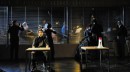 Tanzende Paare begleiten die Zuschauer auf der Bühne bei der Platzsuche. Videogenerierte Türen wackeln dort auf richtigen Durchgängen, die zusätzlich noch auf Rollen stehen und damit das Objekthafte des Bühnenbildes unterstreichen.