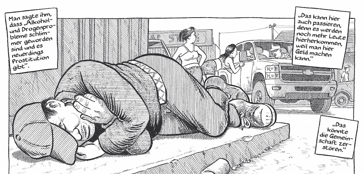Auf dem Boden der Tatsachen erkundet der Comicjournalist Joe Sacco in „Wir gehören dem Land“ den Konflikt der Dene, der indigenen Bevölkerung Kanadas, mit der Gewinnung der Bodenschätze – Öl, Gas und Diamanten. Sacco geht mittels zahlreicher Interviews und Ortserkundungen tief in das Thema, erforscht die unterschiedlichen Positionen auch innerhalb der indigenen Gemeinschaft, erkundet ihre Geschichte und ihre Gegenwart zwischen Natur und dem Raubbau an ihr, von der sie doch so sehr geprägt und doch so sehr abhängig sind. Sacco versucht sich in Neutralität, ist aber immer Teil des Geschehens, das er in aufwändigen, feinen Zeichnungen festhält (Edition Moderne).