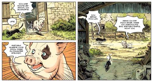 Ja, man merkt dem Comic an, dass Autor Stéphane Betbeder eher mit den Anarchisten sympathisiert als mit der Polizei. Und ja, dem Schlachthof ist in der Geschichte wirklich nichts Gutes abzugewinnen. Doch „Arche Neo“ will gar nicht mit erhobenem Zeigefinger zum Veganismus erziehen. (Wer Massentierhaltung an sich klasse findet, wird mit diesem Comic ohnehin nichts anfangen können. Dem- oder derjenigen sei gute Lektüre sowieso nicht gegönnt.) Vielmehr wecken die Charaktere und Paul Frichets ausdrucksstarke Zeichnungen beim Leser Sympathien für die tierischen Protagonisten (wenngleich dies erst nach einer nicht ganz so geglückten Exposition erfolgt). Und die Reflexion über unser eigenes Verhältnis zur Natur stellt sich dabei ganz von alleine ein. Wenn wir nämlich lernen, dass auch Schweine zusammen mit ihren Artgenossen und „Menschenweibchen mit Zitzen in Beuteln“ auf den Bahamas planschen wollen, dann merken wir, dass wir uns gar nicht so unähnlich sind.
