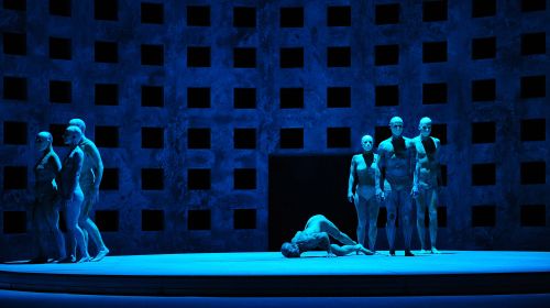 Individuen ohne Identität betreten den Kreis des Schreckens, kümmern sich um den Gepeinigten und brauchen Minuten, um mit Liliom durch den dunklen Gang zu verschwinden. Endlose Minuten werden das, großartige Minuten, das ist keine Zeitlupe mehr, das werden No-Theater-Assoziationen, und das hinter der Schwebebahn in der Wuppertaler Oper. Das Publikum dort stöhnt da bereits lauter, als es Franz Molnárs Protagonist je ausleben könnte. Und Sybille Fabian zieht im großartigen Paul Weber-Bühnenbild von Herbert Neubecker die künstlerische Daumenschraube weiter an. Wie schon bei ihrer Wuppertaler „Lulu“-Inszenierung agieren die Personen nur noch triebgesteuert, haben die Kontrolle über die Bewegung ihrer Extremitäten längst verloren, die schnuckelige Vorstadtlegende wird zur Groteske einer vom Geist befreiten und dadurch verkrüppelten Gesellschaft. „Da wär‘ ich doch lieber zu Desirée Nick gegangen“ tönt es hinter mir, das Geschehen auf die Bühne spiegelt tatsächlich auch noch boshaft den Zuschauerraum. Kunst kann eben manchmal wehtun, mehr als das Fegefeuer für Liliom, in das er wegen einer Liebe gesteckt wird, die er selbst gar nicht verstehen kann. Mittendrin tauchen dann Vermummte auf, die mit Schnellfeuerwaffen aufs Publikum schießen. Ein Break, der eigentlich überflüssig ist auf dem Weg, Dantes Inferno ohne Kostüme zu zelebrieren.