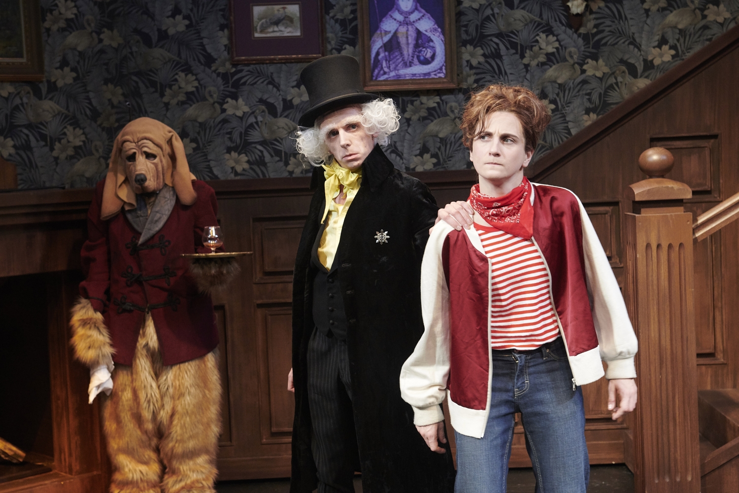 So weit, so gut. Cedric fährt mit Mr. Havisham nach England, seine Mutter bleibt anders als in der Vorlage erst einmal zurück, aber sie telefonieren täglich, während Cedric den alten Grafen umkrempelt. Die Bühne hat sich im Kreis gedreht, zeigt nun das Kaminzimmer des Schlosses, in dem der junge New Yorker nicht die Konventionen des alten Adels, sondern lieber das Platt der einfachen Bauern lernt. Auch hier lässt die Regie dem Sentiment nur bedingt Raum und Ruhe, immer wieder wird das Melancholische vom Chaos verdrängt, immer wieder lassen kleine Gimmicks wie die das Ponyreiten um das Anwesen – großes Kino mit Mokka und Silberstreif, der alten prächtigen Stute mit Gehhilfe – oder der alte Hund Dougal als Diener, der partout nicht das Stöckchen holen will, die Kinder und Jugendlichen in den Zuschauerreihen kreischend atemlos werden. Der Graf von Doringcourt tut längst Gutes, ohne es anfangs wirklich zu wollen, doch sein amerikanischer Enkel hat sein Herz längst erobert, die Mutter darf (immer noch auf Rollschuhen!) kommen, das Stück scheint dahin zu fließen. Also: Henner Kallmeyer generiert eine schrille dramatische Wende. Eine sehr falsche Frau (sehr chic und wortgewaltig: Konstantin Rickert) will mit ihren zwei missratenen Söhnen das Erbe an sich reißen, die ganze Sache wird gefährlich, doch Cedrics Kumpel, der Schuhputzer Dick, rettet alles.