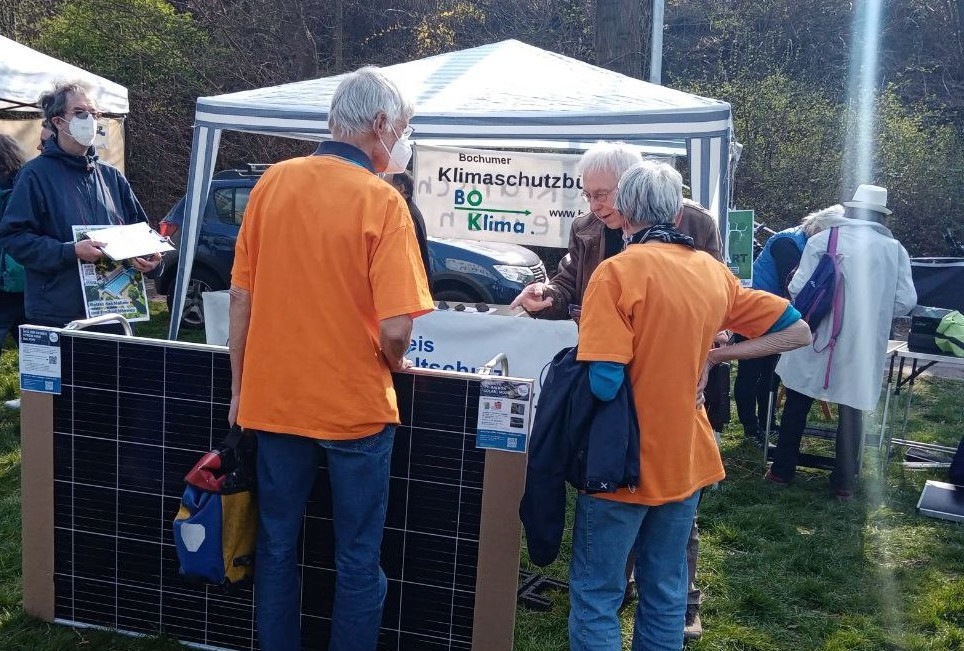 „Klimaschutz und Energiewende sollen für alle erfahrbar und mitgestaltbar werden“ – das ist den beiden Mitinitiatoren des Bochumer Klimaschutzbündnisses wichtig. Sicherlich gebe es die Politik, die mit Richtlinien für eine klimagerechtere Welt sorgen müsse – parallel dazu könne aber auch ein Umdenken bei jedem Einzelnen angeregt werden. Es lohne sich nicht, den Leuten Angst zu machen vor der Klimakatastrophe, stattdessen brauche es neue Erzählungen davon, wo wir hinwollen mit Klima- und Umweltschutz, und dafür müsse man miteinander ins Gespräch kommen. Und das tun I. und T. bei ihrem Infostand auf der Wiese des Bergbaumuseums. Mitgebracht haben sie ein Stecker-Solar-Modul, das jede*r bequem privat nutzen kann, ob auf dem Balkon der Mietwohnung oder auf dem Dach des Gartenhäuschens.