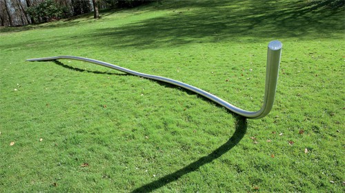 Einen wirklich guten Einblick in dieses wichtige Werk bietet nun die Schau im Skulpturenpark Waldfrieden. Dafür sind im Pavillon eine Vielzahl überwiegend kleiner, modellhafter Arbeiten und im Außenraum drei große Skulpturen zu sehen. Die kleinen Arbeiten vermitteln das Vokabular und die Systematiken. Die großen zeigen gewissermaßen die Wirkung: das Durchqueren des Raumes und dessen Ausloten, die (virtuelle) Zeichnung im dreidimensionalen Raum. Am anschaulichsten teilt dies hier die „Raumplastik Große Kurve 2/1980“ mit, die sich hinter der Villa Waldfrieden befindet. Wie eine Raupe stupst sie die Luft, krümmt und biegt sich leicht, so dass sie nur an einzelnen Punkten die Wiese berührt. Die Präsentation in Wuppertal ist genial. Auf der einen Seite von einer überlebensgroßen statischen Figur von Thomas Schütte begrenzt, spiegelt sich in der Fensterscheibe der Villa das Knappe, Leichtfertige und doch Zielstrebige der Linie. Vielleicht ist das ja die große Leistung dieses wichtigen Bildhauers, der wie Tony Cragg als Professor für Bildhauerei an der Düsseldorfer Kunstakademie lehrte und als einer seiner Vorgänger deren Rektor war: Die Linie zu beleben und mit ihr die Umwelt zu aktivieren.
