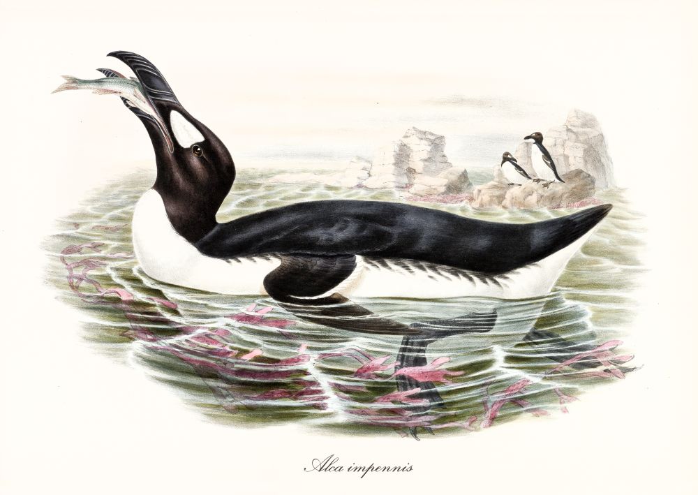 Der Riesenalk ist keine Nebukadnezar-Flasche Champagner, sondern ein Vogel. Gewesen. Ein Vogel, der schon allein mit seinen Namen gleich zweifach pubertäres Kichern auslöst und linguistische Verwunderung. Der mit seiner Gestalt und Fortbewegungsweise ebenfalls gleichzeitig für Erheiterung und Erstaunen sorgt. Und der den Fortbestand seiner Art für eine spannende Geschichte über die Schlechtigkeit des Menschen hingegeben hat.