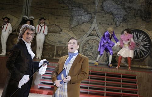 Wer allerdings auf eine dynamische Choreografierung der abstrusen Weltreise hofft, wird enttäuscht. Coopers doch etwas eindimensionale Tanzeinlagen können mit seiner Regieleistung leider nicht mithalten. Wobei man nicht ganz sicher ist, ob es vielleicht auch am Musical-ungeübten Tanz-Ensemble liegt. Voll im Soll ist dagegen Alexander Franzen (Pangloss), einer unserer charismatischsten Musical-Darsteller. Er gibt dem Stück den nötigen schauspielerischen und gesanglichen Pfeffer, zu dem Gideon Poppe (Candide) seinen warmen Bariton und Emily Hindrichs (Cunegonde) ihren glasklaren Sopran beisteuern. Ob Bernstein Cunegondes durchdringende Koloraturen bei „Glitter and Be Gay“ als Parodie auf so manch „überzüchtete“ Opernstimme komponiert hat? Alles ist möglich in dieser ausschweifenden, frivolen, wenig zimperlichen und nicht immer „jugendfreien“, satirischen Suche nach der Besten aller möglichen Welten, die zu einem musikalischen Hochgenuss wird.