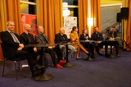 Groß ist nicht zuletzt Kreis wie auch Rang der Teilnehmenden der Kulturszene, die sonst selten gemeinsam auf einer Bühne stehen. Das Ensemble der Kölner Hochschule für Musik und Tanz, (Standort Wuppertal) trägt den Abend musikalisch. Mathias Haus schuf dafür Kompositionen mit dem Anspruch, die Worte in moderne zeitgenössische Musik zu verwandeln. Gespielt werden diese von einem zehnköpfigen Orchester–- darunter neben Klavier und Streichern auch Schlagzeug, Harfe und ein Flügelhorn. Schauspieler der Bühnen sind aufgefahren, darunter der Intendant, eine Tänzerin aus Pina Bauschs Zeit an der Spitze des Tanztheaters, ein renommierter Lichtkünstler.