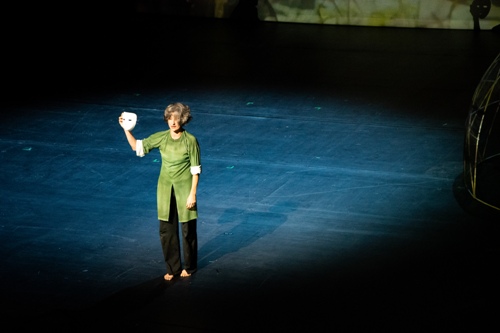 Was dann die Bühnenaktion und ihre Akteure betrifft: Da gibt es einerseits Figuren und, andererseits, kurz gesagt, Sprecher. Zu Letzteren gehört Thomas Braus, der schon zu Beginn ans Mikro tritt: würdevoll, aber in gebotener Zurückhaltung. Auch Bernd Kuschmann, langjähriges Ensemblemitglied des Schauspiels und einst Braus‘ Kollege, gibt Auskunft zu Flucht gestern und heute; wer immer fasziniert schon von der Präsenz seiner Stimme war, ist vielleicht ganz froh, dass er heute meist aus dem Hintergrund liest und so gleichfalls darauf verzichtet, die letztlich sachliche Rolle zu einnehmend werden zu lassen.