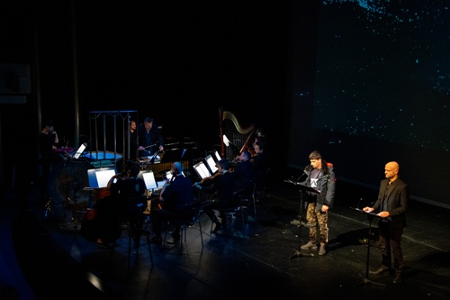 Bei besagter Pluralität der Mittel ist zunächst einmal protokollarische Sorgfalt sinnvoll, um den Überblick zu sichern, beginnend mit den kontinuierlichen Elementen: Ein Video des Lichtkünstlers Gregor Eisenmann läuft als Projektion wandfüllend zum gesamten Bühnengeschehen. Angelegt ist es abstrakt bis assoziativ; konkret wird es etwa wenn es vorne um Flüchtende in Seenot geht und die zuweilen amorphen Bilder sich formen zu fragilen Schiffchen. Sie machen die Lebensgefahr neben der verbalen Live-Aktion hinreichend sichtbar. Mehr Visualisierung braucht es nicht. Eine Art „Stream“ bildet zusammen mit dem Film die Musik: Das Hochschulensemble vertritt verlässlich die zweite Kunstform des Abends, die durchgängig präsent ist und prägt. Das kann bei allem Orchestralen auch schon einmal nach Pop klingen, wo es passt.
