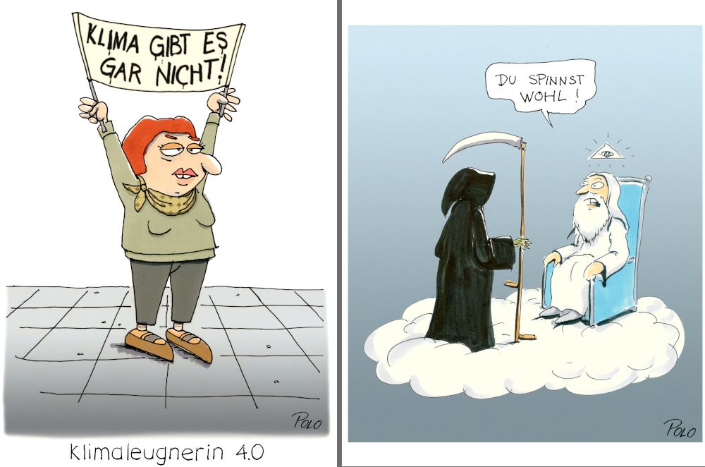 „Du spinnst wohl!“ hieß es in einem der zahlreichen Kommentare, nachdem sein für viele überraschender Tod auf POLOs Facebookseite bekannt gegeben worden war. Ein Kommentar, der im ersten Augenblick unangemessen erscheint. Es war jedoch eine Verneigung vor dem Werk des Cartoonisten, das kurz vor seinem Tod noch unter genau diesem Titel in der Caricatura Galerie für Komische Kunst in Kassel in einer großen Ausstellung geehrt wurde. „Du spinnst wohl!“ ist die der Ausstellung titelgebende Sprechblase aus einem Cartoon, in dem der Sensenmann auf einer Wolke vor Gott steht. Mit einem ungläubigen Blick und besagtem Zitat erwidert der Allmächtige die Frechheit des Schnitters. Somit wird Gott in POLOS Zeichnung zutiefst menschlich: Wir alle können den Tod nicht fassen. Nach den Verlusten von Uli Stein, Andreas Prüstel und Martin Perscheid hat die Komische Kunst in relativ kurzer Zeit nun auch mit dem viel zu frühen Verlust von POLO zu kämpfen.
