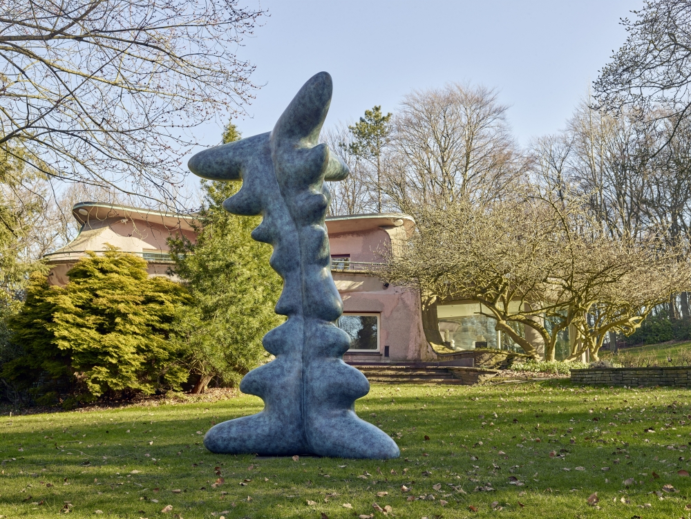 Das ist ja ein Ding: Vier Meter hoch ragt das türkis-grau gefleckte Gebilde empor. Ein eigenwilliger Fremdkörper im Waldpark, obgleich er an Tannen mit verschmolzenen Spitzen erinnert. Jaana Casparys Bronzeskulptur „upside down“ steht als Neuzugang der Cragg Foundation auf dem Rasen neben der Villa im Skulpturenpark – in guter Gesellschaft und einer Linie mit zwei figurativen Miró-Skulpturen („Femme“, 1981, und „Personnage“, 1978). Diese kleine Prozession anzuführen, verleiht „upside down“ eine eigenwillige Persönlichkeit, die nicht recht zu fassen ist.