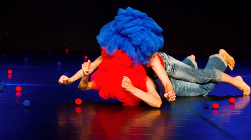 Wenn nichts mehr zu retten ist, sagen wir „Alles im Eimer!“. Aber in der neuen Tanzproduktion von Barbara Fuchs dreht sich alles um zwei Eimer, die voller Ideen und Emotionen stecken. Der eine ist rot und der andere ist blau, zwei Farben und zwei Enden der Welt, als die Eimer von den beiden Tänzerinnen Emily Welther und Odile Foehl ausgeleert werden, bedeckt ihr Inhalt gleich die ganze Bühne der Veranstaltungshalle von Barnes Crossing. Überall liegen Nasen herum, mit denen man sich verwandeln kann, wie überhaupt die Verwandlung unablässig den Fortgang des Geschehens bestimmt.