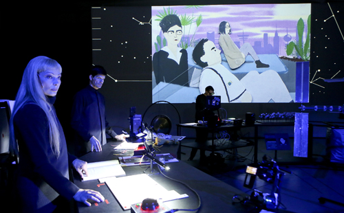 In Dortmund wird die Geschichte um den „Achten Weltkongress“ im 106-stöckigen Hilton Costricanas in einem hochtechnisierten „Bastel-Laboratorium“ mit Videoleinwand, wo ein Live-Animationsfilm entsteht, erzählt, den das Medienkunst-Kollektiv sputnic (Malte Jehmlich, Nicolai Skopalik und Nils Voges) inszenieren. Sie nennen ihre Regie-Idee „Live-Animation-Cinema“. Gesehen hat man das Konzept bereits bei Houellebecqs „Die Möglichkeit einer Insel“ vor zwei Jahren, damals noch im Großen Haus des Dortmunder Theaters. Die technischen Möglichkeiten entwickelt das Kollektiv immer weiter, der handgemachte Charme bleibt, auch in seiner vorsätzlichen Unvollkommenheit. Manchmal erinnert das auch an die animierte Science-Fiction-Fernsehserie „Thunderbirds“ und ihre International Rescue-Truppe Mitte der 1960er.