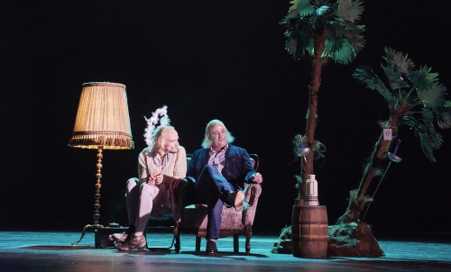 Zu Beginn aber steht Stefan Walz noch einsam und allein auf leerer Bühne, weniger ein Herzog, noch weniger ein Zauberer, mehr so der Typ von nebenan oder gleich darüber. Er erklärt seine Situation in einfachen Worten, schafft Klarheit über die Historie, noch bevor die Handlung wie sonst immer auf der Insel startet. Der neue Intendant von Wuppertal schleppt derweil die Requisiten heran. Mal ne Palme, eine Stellwand. Eine Nebelmaschine spuckt die ersten Wölkchen Trockeneis (oder Nebelfluid), denn Thomas Braus ist Ariel, ein Luftgeist, der einst in einem Baum steckte und jetzt dem Prospero für seine Rettung dient, gern immer wieder mit Nebelmaschine. Und weil Thomas Braus mehr so ein Vollblutmime denn Theaterverwaltungschef ist, kann er auch Caliban, den missgestalteten Sohn der Hexe Sycorax spielen, Himmel und Hölle gern gleichzeitig, kein Problem, weißes Federkränzchen wie Lorbeer hin oder her. Der Rest der grandiosen „Duke´s Men“ sitzen noch im Orchestergraben an Tischen, mit Kostümteilen, Perücken und Schminkutensilien, und warten auf den Auftritt, bei dem Bühnen- und Kostümbildnerin Pia Maria Mackert vieles bewusst provisorisch scheinen lässt, selbst Prospero-Tochter Miranda sitzt erst einmal als Muppet-Puppe irgendwo herum, während der Vater noch dauerdeklamiert und Ariel im Hintergrund schuftet.