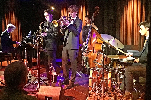 Man hört es dem Spiel an, dass sich die fünf Nachwuchsjazzer, die sich im Jugendjazzorchester NRW kennenlernten, noch in Ausbildung befinden. Lupenrein kommt zwar der Swing seitens der Rhythmusgruppe (Klavier, Kontrabass, Schlagzeug) daher. Doch wirken die Vorträge ein wenig steif, als wolle man nur ja nichts falsch machen. Erst gegen Ende des Abends geht es lockerer, befreiter zur Sache. Dessen ungeachtet beeindruckt Lorberg mit variablen, groovenden Basstönen. Hein geht rhythmisch perfekt mit seinem Drumset um, sein Umgang mit Becken und Trommeln könnte nur ein wenig kreativer sein. Lauer sorgt für elegante Harmonien, seine Soli gestaltet er getreu der vergangenen Zeit, nur etwas brav. Dagegen sind die Improvisationen von Knauft außerordentlich kreativ, die er von sachten Anfängen allmählich hin zu heftigen Klangwelten führt. Brieden überzeugt mit einer runden Tongebung, könnte aber noch an einem fehlerfreien Ansatz in den hohen Tongefilden feilen
