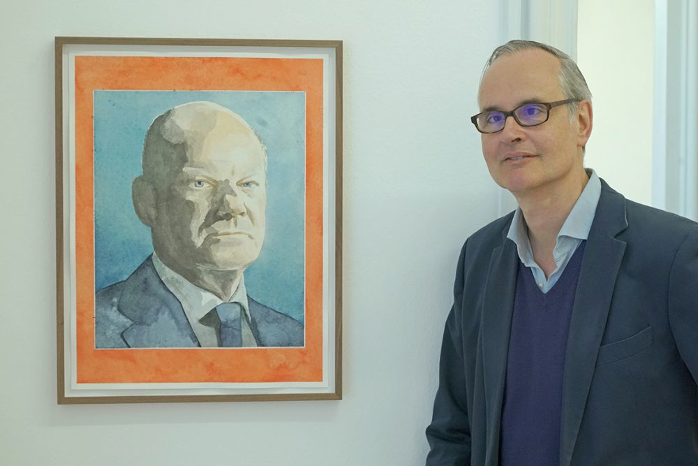 Fritz Emslander mit Jody Korbachs „Kanzlerportrait“, Foto: Jochen Müller / Museum MorsbroichIm Video „Durchgehend“ von 2015 zieht er einen rollenden Reisekoffer durchs leere Museum. Ist das der direkte Kontakt zu einer Welt, in der Technologie uns zunehmend in den Hintergrund rückt?