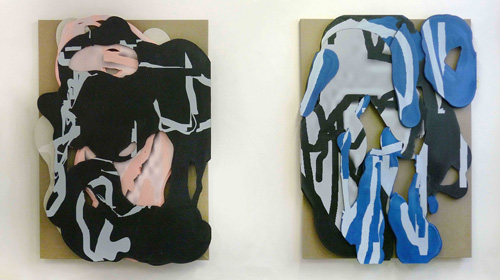 Im Atelier auf dem Liesegang-Gelände in Düsseldorf-Bilk. An der Stirnwand hängen drei großformatige Bilder. Schon von der Seite, beim Eintreten, wirken sie aufregend, lebhaft und sinnlich, von einzelnen Farbtönen bestimmt, die sich körperhaft, in breiter Bahn schwungvoll über die Bildfläche ziehen. Die Leinwand schaut, farblos grundiert, an den Seiten heraus. Angedeutet sind Ornament und Rhythmus; Positiv und Negativ verhalten sich gleichwertig zueinander: Die Bilder von Nikola Ukić sind eine intelligente Malerei zum Thema Malerei. Aber – ist dies überhaupt Malerei? Die Leinwand liegt tatsächlich etwas tiefer, die Farben sind gar nicht mit dem Pinsel gesetzt, sondern scheinen die gesamte Form zu durchdringen, welche wie gegossen wirkt, zumal ihre Kanten die gleiche Farbigkeit besitzen. – Und schauen auf unterschiedlichen Ebenen nicht auch Fotografien durch, sind nicht Splitter von Formen gedruckt, über denen die Farbe mäandert?