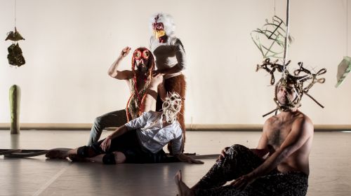 Aber dem einengenden Korsett der Programm-Erläuterungen muss man ja nicht folgen. Es reicht völlig, die wunderbare bunte Bilderwelt von „Corps Étrangers“ zu genießen, die bizarren Kostümierungen, die Verkleidungen in zuvor nie gesehene Fabelwesen und natürlich die exzellenten Akrobatik-Einlagen außergewöhnlicher Artisten, die den Abend zu einem unterhaltsamen Ereignis machen. Der routinierte Umgang von Mathieu Antajan mit dem Vertikalseil und seine verwegene Luftartistik; die witzige Partnerakrobatik von Tim Behren und Florian Patschovsky, die mit einem gekonnt verklammerten Vierfüßlergang fantasievolle Tierwesen vor unser geistiges Auge holen; die menschlichen Pyramiden, die dreifach gestapelt in die Höhe ragen – das alles sind Highlights artistischer Unterhaltung. Wenn Mathieu Antajan wie von einer unsichtbaren Hand in die Höhe gezogen wird, dann wieder kopfüber nach unten stürzt, ist noch am ehesten etwas vom Geheimnis unserer Entwicklung zu spüren. Kein Wunder, dass bei so viel Akrobatik, Saltos, Radschlagen und Kletterlust der Tanz auf der Strecke bleibt. Bleiben grad mal einige anspruchslose rhythmische Gruppenformationen mit vorreligiöser Anmutung. Zu diesem Inszenierungsstil passen dann auch die überzogenen Lichteffekte und Gegenlichtszenen, der achtzig Minuten enervierende elektronische Live-Sound voll obskurer Tierlaute und die bei Thiersch üblichen Blackouts von Ton, Licht und Bewegung.