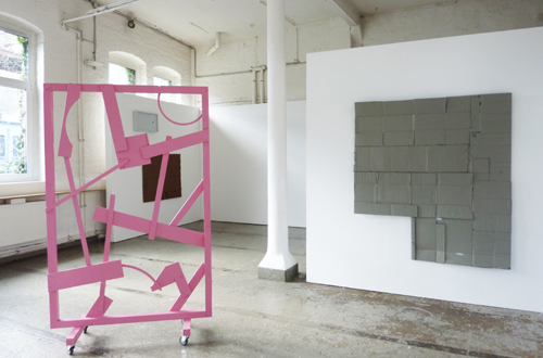 Was für eine Farbe mitten im Ausstellungsraum: Rosa, aufgetragen auf ein Holzgestell auf Rollen, welches also verschiebbar ist. Die kantigen Holzstücke, die in den Rahmen hineinragen, scheinen wild zusammengezimmert. Aber dann wird klar, wie exakt Bert Didillon sie aufeinander bezogen hat, und wie stabil sie sich halten. Und doch scheint alles – fast erzählerisch – in Aufruhr. Das Rosa, das sich doch zwischen allen Stühlen verhält, besitzt die faktische Präsenz eines Überzugs, und man ahnt, wie genau der Ton ausgelotet ist. In der vorsichtigen Bedachtheit aller Teile kommen mögliche Referenzen in den Sinn, besonders zum russischen Konstruktivismus, der mit seiner reduzierten Formsprache und seinen Beiträgen im angewandten Bereich überhaupt ein wichtiger Bezug für Bert Didillon ist. Natürlich, da sind auch „Das große Glas“ von Marcel Duchamp und mit der vermeintlichen Sperrholz-Ästhetik Kurt Schwitters. Oder klingt hier nicht vielmehr – wenn man auf das Kreissegment im oberen Winkel schaut – Tom Wesselmann mit seinen Landschaftsausschnitten vor untergehender Sonne an? Sollte man das Gestell nicht vor ein Fenster schieben? Überhaupt, was ist Vorderseite und was ist Rückseite? Und dann fallen die kleinen Episoden des Imperfekten auf. Die rosa Farbspritzer auf den schwarzen Gummirollen und das „Gebastelte“, das sich an der Grenze zwischen Funktion und Unsinnigkeit, gewöhnlich und seltsam, profaner Do-It-Yourself-Ästhetik und Überhöhung zum Luxus verhält.