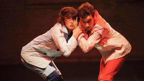 Erst allmählich agieren die beiden Figuren miteinander, zuvor werden sie von einem großen Auge beobachtet, das von der Decke hängt. Ein origineller Einfall, wie überhaupt die Produktion stilistisch sehr geradlinig ausfällt. Hier wusste jemand genau, was er wollte. Eine Qualität, die man in Tanzproduktionen nicht immer antrifft. Die Figuren sind nur das, was sie tun, sie besitzen keine Innerlichkeit. Auch wenn sie bekannte Bewegungen ausüben, beziehen sie sich nicht auf etwas Vorgegebenes. Das Spiel ist reine Oberfläche, genau wie die Comics. Die Inszenierung zeigt, wie die Comics funktionieren. Sie bestehen alleine aus den Farben, Formen und Aktionen, die dargestellt werden. Jede Handlung visualisiert sich, Gefühle sind nicht angelegt. Deshalb gibt es viel Slapstick. Aber niemand, der sich eben noch einen Schwinger eingefangen hat, wird verletzt. Man steht auf, und schon geht es weiter. Nur am Ende gibt es dann doch eine zärtliche Geste, die beiden treten in Beziehung zueinander. Das ist eine schöne Volte, mit der Yui Kawaguchi dem Regelwerk der Comic-Ästhetik ein Schnippchen schlägt. Eine eigenwillige Produktion, die man auch aufgrund des pointierten Sounddesigns (Sibin Vassilev) und des stimmungsvollen, mitunter sogar ironisch gesetzten Lichts (Fabian Bleisch) zu den Entdeckungen des Festivals zählen darf.