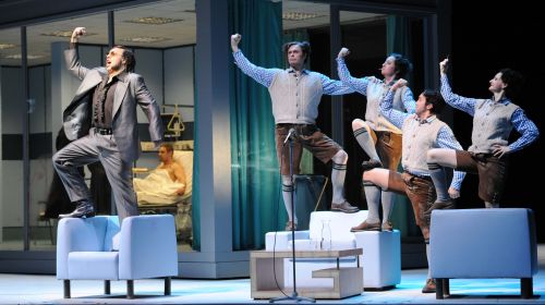 Für seine letzte Produktion holt sich Soltesz mit Joachim Schloemer noch einmal einen Neuen nach Essen. Der zeigt eine moderne, aber keine sonderlich gewagte Inszenierung. Den leidenden König Amfortas, dessen Wunde in der Seite nicht heilen will und täglich wieder aufbricht, inszeniert er auf einer modernen Intensivstation, die sich in einer Art Lazarett-Container befindet (Bühne: Jens Kilian). In einer Endlosschleife schleppt sich der König mit durchgebluteten Verbänden aus seinem Krankenbett, fällt gegen die Fensterscheibe, verschmiert effektvoll sein Blut und wird von herbeieilenden Pflegern versorgt, die ihn waschen und die Verbände wechseln. Es folgen die Schwestern, die das Bett herrichten, der Hausmeister, der die Vorhänge repariert – und alles geht wieder von vorne los.