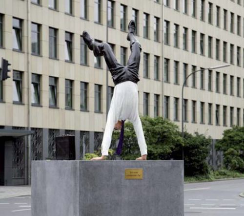 Die Handlung passt zum Ort, dem Kasinokreisel in Elberfeld. Im rauschenden Verkehr mit den ins Büro hastenden konformen Angestellten, vis-à-vis die Deutsche Bank, stockt seit letztem Herbst jede Bewegung: Auf einem Sockel macht ein austrainierter, tadellos gekleideter Teilhaber unserer Verwaltungen einen Handstand, den Aktenkoffer neben sich abgestellt, der Anzug sitzt tadellos. Siegermentalität kommt zum Ausdruck, Lockerheit wird zelebriert und konfrontiert in einem extra platten Realismus mit einem erfolgreichen Alter Ego. Zumal infolge der Bankenkrise schwingt aber noch ein anderer Ton mit, der zusätzlich bewirkt, dass dieses Kunstwerk trotz seiner Filigranität und seines „gewöhnlichen“ Look kaum aus dem Kopf geht – das ist seine Leistung an diesem Ort. Dieses Denkmal auf den (anonymen) Werktätigen heutiger Tage, durchaus in der Tradition des sozialistischen Realismus, stammt von Guillaume Bijl.