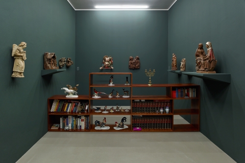 Haim Steinbach, Display #92 – Collectibles of Maria Kornherr, 2018, verschiedene Objekte und Bücher, © courtesy der Künstler und Tanya Bonakdar Gallery New York / Los Angeles