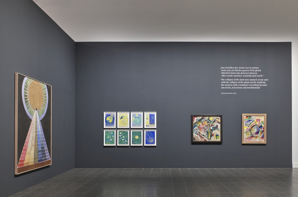 Wir können uns gar nicht vorstellen, wie neuartig und ungewohnt diese Malereien damals waren, im frühen 20. Jahrhundert. Die Gemälde von Hilma af Klint und Wassily Kandinsky entstanden in Zeiten politischer Krisen, der Folgen der Industrialisierung und einer neuen Geschwindigkeit. Die wissenschaftliche Erkenntnis, dass sich Materie auflösen konnte, beförderte das Spirituelle. Hilma af Klint und Wassily Kandinsky veranschaulichen in ihren Bildern Beweglichkeit, das Nichtfassbare und Vergeistigung, den Kosmos. Kandinsky bewahrt skizzenhaft die Wirklichkeit, ehe er freie Formkonstruktionen in einem Fluidum schweben lässt. Hilma af Klint malt prismatische Aufspaltungen und fügt geometrische Formen in einen Farbraum ein. Partienweise malt sie realistisch und verknüpft so die geistige mit der irdischen Welt.