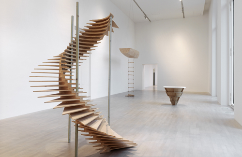 Das ist die formale, bildhauerische Seite. Und mit dieser verselbstständigen sich die Skulpturen im Ausstellungsraum. Da ist das Kanu, das über Kopfhöhe hängt. Aus einem kreisrunden Loch in der Bodenfläche fällt eine Strickleiter bis auf den Boden, sodass wir an das Seil des Fakirs denken und nun eigentlich hoch und hinein steigen könnten. Aus der Not – dem Unbrauchbaren für die Schifffahrt – wird die Tugend des Luftschiffs. Eine Wendeltreppe erinnert an eine Wirbelsäule. Zusammengesteckt aus zerbrechlich dünnen Holzscheiben im Stecksystem, endet sie auf halber Höhe. Umfasst ist die Treppe von drei hellgrün gestrichenen Latten, von denen eine auf der zweiten Stufe aufsitzt und die obersten Holzplättchen trägt: Diese Feinheit und geradezu existenzielle Fragilität kam man kaum beschreiben, man sollte es sich anschauen. Die 1977 in Pristina geborene, in Düsseldorf lebende Leunora Salihu hat an der Düsseldorfer Kunstakademie bei Tony Cragg studiert. Seit gut einem Jahrzehnt gewinnt ihr Werk stetig an Ansehen, sie wurde mit wichtigen Stipendien ausgezeichnet und wird von einer Galerie in Berlin vertreten. Dass es solche Skulpturen im Jahr 2017 gibt und dass sie nun auch im Museum zu sehen sind, ist richtig gut.