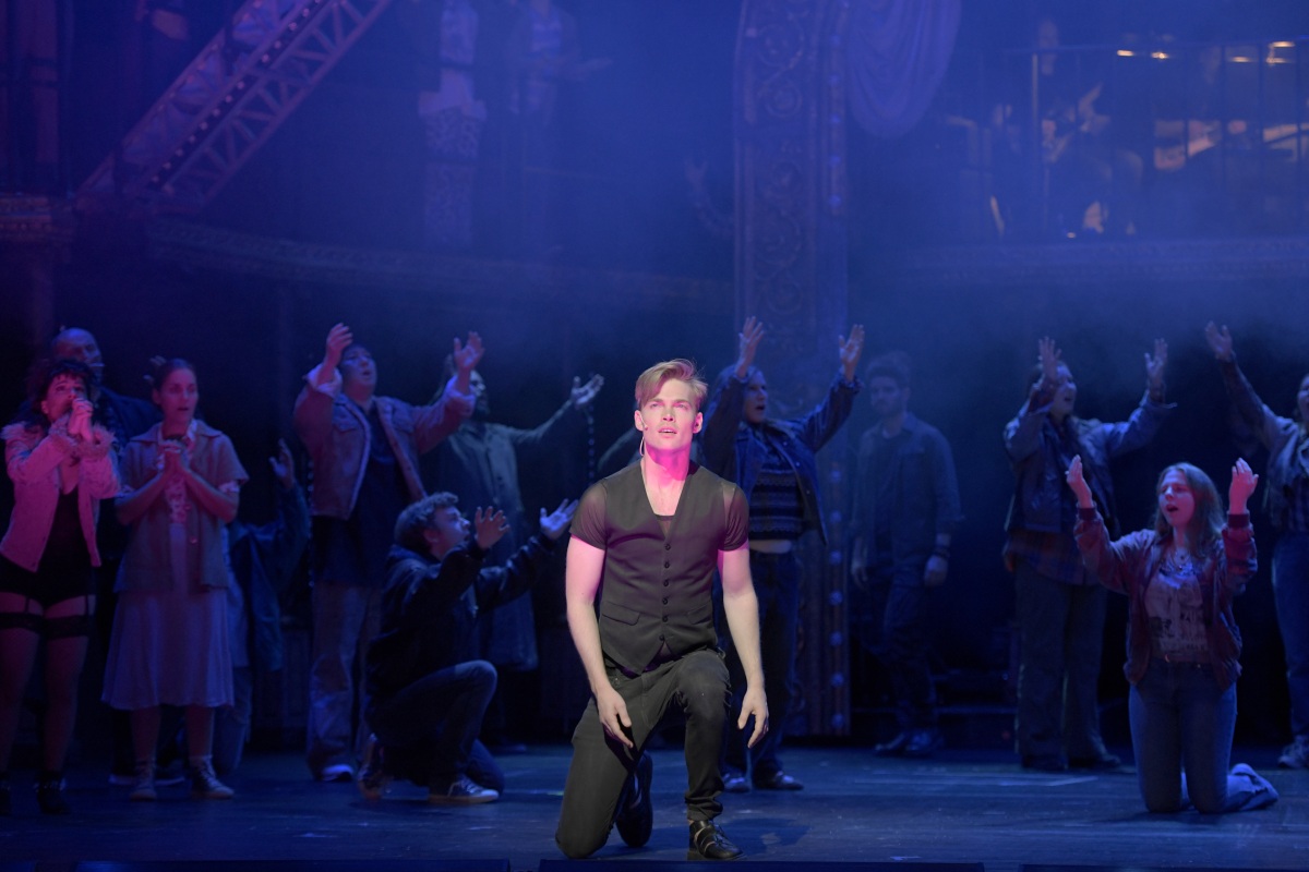 Zugegeben, die reduzierte Orchesterbesetzung ist ein Kompromiss, mit dem es sich meist gut leben lässt, denn die Band trägt im Wesentlichen das musikalische Gerüst. Und doch hat der klangliche Luxus, den sich Wuppertal jetzt gönnt, eindeutig seinen Reiz. Wenn volle Bläsersätze aus dem Graben tönen, ist das schon ziemlich überwältigend. Und dass die zahlreichen echten Streicher jeden Synthie meilenweit in den Schatten stellen, versteht sich quasi von selbst. Die Band sitzt übrigens im Obergeschoss der Kulissen, die eine Art Varieté-Bühne auf der Bühne (von Sam Madwar) darstellen. Dirigent Jürgen Grimm hält mit „Klick im Ohr“ die musikalischen Stränge aus dem Graben heraus zusammen. Das funktioniert tadellos gut. Die vielen stark synkopierten Riffs und Grooves kommen knackig (und ordentlich laut) auf den Punkt. Das müssen sie auch, denn in der mitunter recht atemlos wirkenden Abfolge der Songs, die durch keine gesprochenen Dialoge unterbrochen werden, würde sonst rasch die treibende Kraft des Stücks kollabieren. Eine solche Gefahr droht in Wuppertal zu keine Zeit. Denn Jürgen Grimm hat die Produktion schon rund 40 Mal im Staatstheater Oldenburg musikalisch geleitet, von dem Wuppertal sie übernommen hat. Dort spielte Petersen übrigens mangels Orchester noch selber die Keyboards.