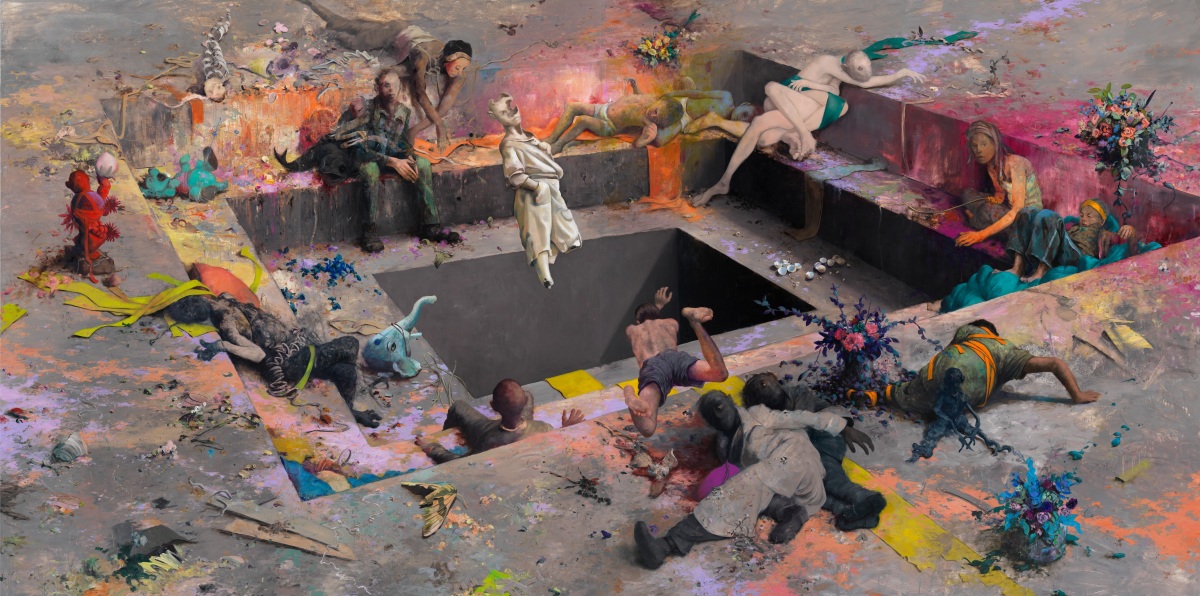 Es ist gar nicht mal so sehr die Monumentalität der Malerei von Jonas Burgert, die den Betrachter in ihren Bann zieht. Überwältigend sind vor allem die kippenden Perspektiven, die Bildachsen, die aus den Fugen geraten sind, die im Dunkel leuchtende Pracht der Farben und das All-Over vieler Ereignisse im Bildformat, vorgetragen in souveränem Realismus. Alles scheint zur Ruhe gekommen, als habe ein Orkan eine kurze Pause eingelegt. Dazu ragen einzelne Figuren, zu denen auch Tiere treten können, stabil und geradezu plastisch aus den Bildern heraus und tragen zur Ordnung des Geschehens bei. Jonas Burgert vereint Disparates, eine kontrollierte Figürlichkeit mit einem abstrakten Expressionismus, Schönheit mit verstörender Fragmentierung, antike Mythologie mit Gegenwart. Die Handlungsstränge initiieren einen Kreislauf der Geschehnisse, der ebenso selbstverständlich ist wie er rätselhaft bleibt.