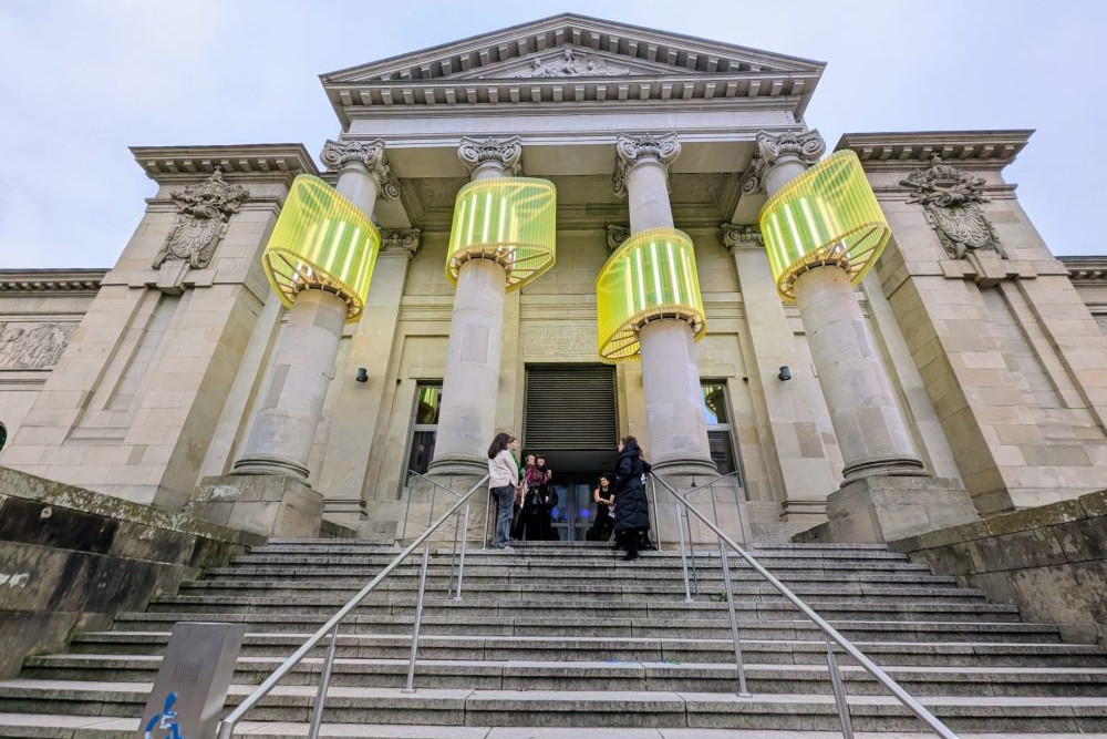 Wir wollen uns ja an ein städtisches Publikum richten, das sehr divers ist. Und wir wünschen uns, dass in die Kunsthalle einfach auch Menschen aus der Fußgängerzone hinein kommen, weil sie wissen, dass da oben im zweiten Stock Kunst zu sehen ist und nicht nur unten eine Bibliothek und das Programm im Haus der Jugend. Daher lassen wir unsere Ausstellungen immer schon vor dem Haus der Jugend starten. Wir beziehen die Fassade mit ein und anderes mehr. Außerdem gibt es jeweils Begleithefte, eins für Erwachsene und eins für Kinder, in denen man nachlesen kann, was man vor sich hat, sollte man sich zu sehr wundern. Darüber hinaus bieten wir ein umfangreiches Rahmenprogramm an, über das man sich auf Webseite und Instagram informieren kann.