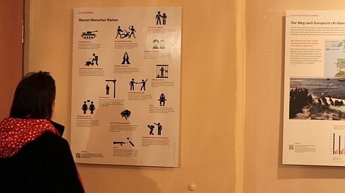 Dennoch gab es durchaus Besucher, die sich die Ausstellung anschauten und die vielleicht später wiederkommen, dann tatsächlich, um in Ruhe alles begehen zu können. Die Ausstellung informiert umfassend über Fluchtursachen, den Syrienkrieg, Fluchtwege und Abschottungspolitik. Neben Syrien informiert die Ausstellung über weitere Krisengebiete. Es ist eine gute und fundierte Mischung aus Texten, Bildern, Grafiken und Fotos, bereitgestellt von Pro Asyl. Anzahl und Ausführlichkeit legen aber vielleicht einen anderen Ort nahe, an dem die Ausstellung nicht droht, im Café-Alltag unterzugehen.