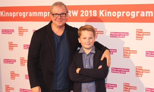 Um den Abend kurzweilig und unterhaltsam zu gestalten, wurden zwischen den einzelnen Ehrungsblöcken, in denen die Kinos gestaffelt nach der Höhe ihrer Prämien ausgezeichnet wurden, Trailer und Ausschnitte aus aktuellen und kommenden Filmen gezeigt. Regisseure und Schauspieler der immer auch zumindest teilweise in NRW gedrehten Filme standen für kurze Fragen auf der Bühne Rede und Antwort und fungierten im Anschluss als Preispaten bei der Überreichung der Urkunden. So beispielsweise Julius Weckauf und Joachim Król, die im neuen Film von Oscar-Preisträgerin Caroline Link, „Der Junge muss an die frische Luft“, die Hauptrollen spielen. Der zehnjährige Weckauf wurde darin als junger Darsteller Hape Kerkelings gecastet, auf dessen erfolgreicher Autobiografie der Film basiert. Auf der Bühne erzählte er von langwierigen Castingprozeduren, die ihn aber nicht entmutigen konnten. „Letztendlich wurde ich’s dann, und das hat mich gefreut“, enthüllte der junge Nachwuchsstar mit entwaffnendem Charme. Sein Filmvater Joachim Król merkte an: „Man kann von Julius lernen, an der Stange zu bleiben und sein Pensum zu erfüllen. Seine Kondition vermisse ich manchmal bei älteren Kollegen.“ Zu den weiteren prominenten Preispaten gehörten auch Timur Bartels und Regisseur Felix Binder, die gemeinsam den Film „Club der roten Bänder – Wie alles begann“ in die Kinos bringen werden, oder Jan Bonny, der zwei seiner Darsteller aus seinem kommenden Film „Wintermärchen“, Jean-Luc Bubert und Ricarda Seifried, mit nach Köln gebracht hatte. Als Paten für die Überreichung der Spitzenpreise mit Prämien bis zu 18.000 Euro fungierten Emilio Sakraya und Regisseur Wolfgang Groos, die gemeinsam „Kalte Füße“ gedreht haben. Ausgezeichnet wurden in dieser Kategorie einmal mehr die Filmpalette in Köln, das Kino in der Brotfabrik in Bonn sowie das Cinema in Münster.