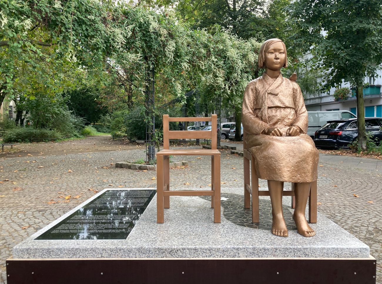 Hintergrund ist die Mahnung an die Kriegsverbrechen: Während des Zweiten Weltkriegs verschleppte die Japanische Armee 200.000 Frauen und Mädchen, die als Prostituierte versklavt wurden. Das Kunstwerk verweist auf diese Betroffenen sexualisierter Gewalt und die letzten Überlebenden, die ihr Schweigen brachen. Japans rechts-konservative Regierung wehrt sich gegen die Thematisierung dieses düsteren Kapitels.