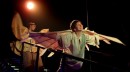 Zwei asiatische Männer laufen durch einen Wald. Der eine, leicht bekleidet, ist mit einer Leine gefesselt, der andere trägt eine schwarze Fahne. Beide tragen Masken, Nasen-Prothesen, einen goldenen Maulkorb, die Szenerie ist undefinierbar, der Wald ebenso. Schnitt...