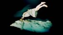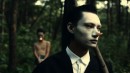 Zwei asiatische Männer laufen durch einen Wald. Der eine, leicht bekleidet, ist mit einer Leine gefesselt, der andere trägt eine schwarze Fahne. Beide tragen Masken, Nasen-Prothesen, einen goldenen Maulkorb, die Szenerie ist undefinierbar, der Wald ebenso. Schnitt...