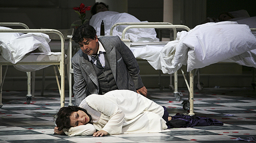 Also warum, fragt man sich, konstruiert Josef Ernst Köpplinger diesen Zeitsprung? Eine substanzielle Antwort wird seine Inszenierung an der Essener Aalto-Oper schuldig bleiben. Also bleibt am Ende der Eindruck: Hier sollte vor allem ein Anlass für eine dekorative Kulisse gefunden werden. Bühnenbildner Johannes Leiacker baut ein edles Zauberberg-Sanatorium mit Alpen-Kulisse, aus dem heraus die sieche Violetta ihr Leben Revue passieren lässt. Seine These von der nahen potenziellen Rettung für die Kranke demontiert der Regisseur somit schon während der Ouvertüre. Seine Violetta hat ganz offensichtlich bereits mit ihrem Leben abgeschlossen. Und nicht nur die Figur ist (zum Tode) verurteilt, Sopranistin Liana Aleksanyan ist von der Regie auch dazu verdammt, bis zum bitteren Ende in einer unvorteilhaften Kombination aus Pyjama und Morgenmantel auf der Bühne zu stehen. Grund dafür ist nicht zuletzt, dass Köpplinger den Dreiakter in gut 100 Minuten durchspielen lässt – eine gute und konsequente Entscheidung. Die darstellerische Entsprechung ihres Kostüms liefert Aleksanyan indes nicht. Sie wirkt weniger wie eine Leidende als vielmehr seltsam unbeteiligt. In Tenor Felipe Rojas Velozo findet sie einen unrühmlichen Gegenpart. So gern man den beiden zuhört, so uninteressant ist es, sie auf der Bühne zu sehen. Unbeholfen laufen sie nebeneinander her und liefern Rampengesänge. Selbst im Moment des Todes der Violetta bleibt Alfredo auf Abstand. Bei den Protagonisten versagt Köpplingers Personenführung vollständig. Die Figur des Vaters Giorgio Germont macht da keine Ausnahme – obwohl auch Mikael Babajanyan eine ordentliche Partie singt. Er ist ein herzloser Machtmensch. Das ist plausibel, aber nicht spannend.