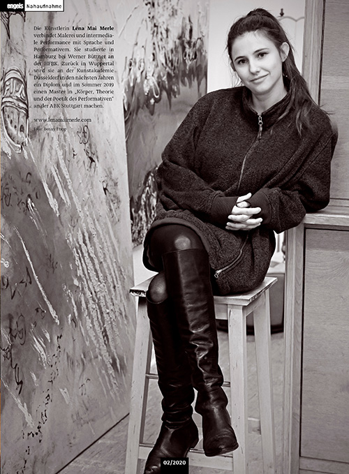 Die Künstlerin Lena Mai Merle verbindet Malerei und intermediale Performance mit Sprache und Performativem. Sie studierte in Hamburg bei Werner Büttner an der HFBK. Zurück in Wuppertal wird sie an der Kunstakademie Düsseldorf in den nächsten Jahren ein Diplom und im Sommer 2019 einen Master in „Körper, Theorie und der Poetik des Performativen“ an der ABK Stuttgart machen.