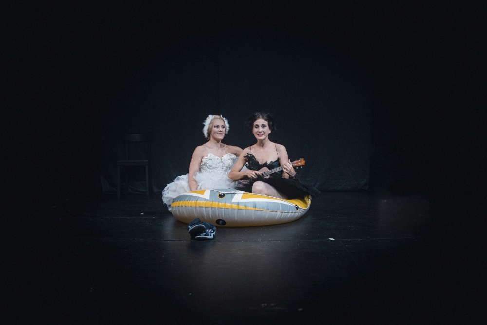 Ist doch klar, an einem Dreispartenhaus, wie Wuppertal es hat, benötigt die Stadt auch ein Dreispa(r)tenkabarett. Warum mein Schreibprogramm da immer automatisch ein US-amerikanisches „Registered Trademark“ einfügt übersteigt meine Kenntnisse – aber mit Gummibooten kenne ich mich seit 1971 dank Gitte aus. Aber das da vorne auf der dunklen Bühne ist nicht knallrot, sondern gelb und das erste wichtige Requisit von Lumpp&Meier, die gleich ihr spitzes Feuerwerk „Vogelfrei“ ausgerechnet im Theater am Engelsgarten abfackeln wollen. Die beiden Kabarettistinnen, Julia Meier ist gerade im Wuppertaler Ensemble, beginnen mit einer Slapstick-Performance zu Schwanensee im Schlauchboot, am Schlauchboot und um das Schlauchboot herum, alles gekonnt dauerhaft auf Spitzenschuhen (Respekt) und mit einer Grandezza an spitzbübischem (darf man das noch sagen?) oder besser spitzmädelschem Witz. Ist das schon respektlos dem ollen Pjotr Iljitsch Tschaikowski gegenüber oder eher den Primaballerinas, die die gute Odette getanzt haben? Egal, das Publikum amüsiert sich köstlich und mehr muss so ein Schlauchboot auf einer vernebelten Bühne ja auch nicht hergeben.