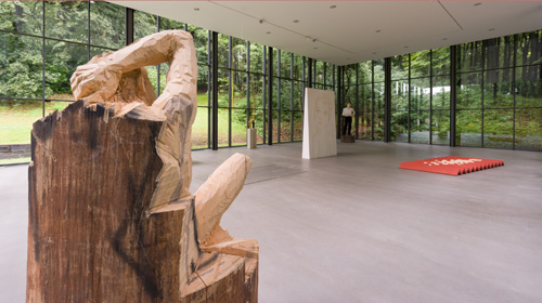 „Sempre più“ ist diesmal der Wächter des Ausstellungs-Pavillons. Mit einer Höhe von 6 Meter direkt davor platziert, sieht man vom Eingang des Skulpturenparks aus zunächst die Rückseite mit der Holzkonstruktion und erst dann den monumentalen männlichen Torso aus Zedernholz. Davor liegen flache Scheiben aus Kupfer und Silber wie antike Münzen und greifen den Farbklang der Skulptur auf. Der Kopf des Mannes mit den dunklen Haaren ist leicht zur Seite und nach vorne geneigt und sorgt so mit seiner ganzen Büste für die formal ausgeglichene Komposition. Sein Blick ist skeptisch, aufmerksam lugend und sehr konkret. Mit seiner Nacktheit kommt eine erzählerische Dimension hinzu, die wir nicht recht zu fassen wissen und die noch unterstreicht, dass wir es nicht „einfach“ mit einer überlebensgroßen realistischen, virtuos aus dem Block geschlagenen Holzskulptur zu tun haben. Balkenhol hat diese Figur vor Jahren für die Präsentation im Forum Romanum geschaffen, sie ist vom Typus der antiken Skulptur abgeleitet, und dieser Bezug ist nun auch ein Leitmotiv der Ausstellung im Skulpturenpark Waldfrieden: Die Zusammenführung der klassischen Bildhauerkunst mit einem heutigen Lebensgefühl.