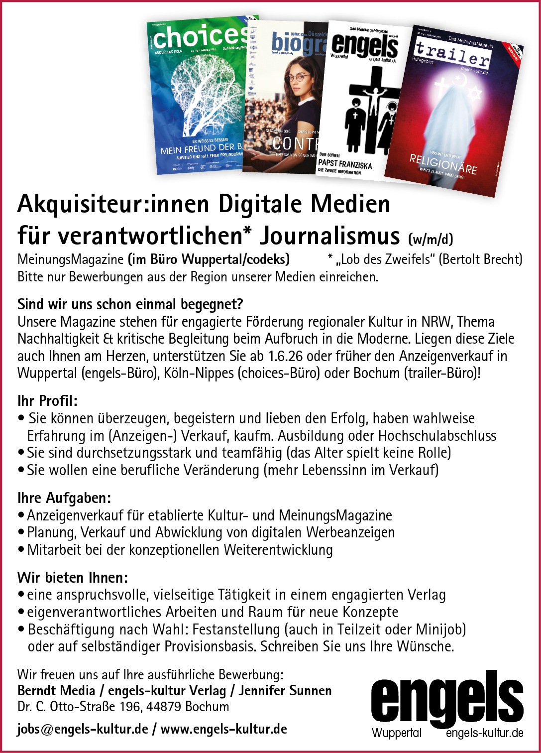 Bochum, Bonn, Castrop-Rauxel, Dortmund, Düsseldorf, Duisburg, Essen, Frechen, Gelsenkirchen, Hagen, Herne, Hürth, Köln, Leverkusen, Lünen, Mülheim, Neuss, Oberhausen, Recklinghausen, Solingen und Wuppertal