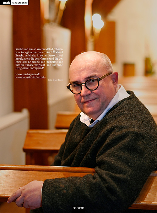 Kirche und Kunst, Wort und Bild gehören von Anbeginn zusammen. Auch Michael Bracht verbindet in seiner Person zwei Berufungen: die des Pfarrer und die des Künstlers. Er genießt die Freiräume, die ihm die Kunst ermöglicht – mit und ohne „religiösen Hintergrund“.