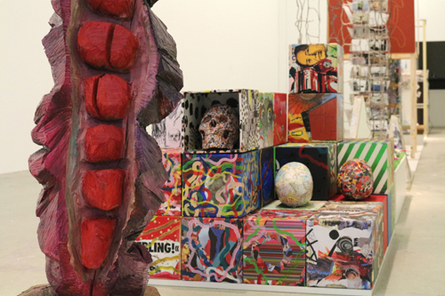 Die Ausstellung beginnt mit Eckehard Lowisch, der zwei gelbe Röhren – wie Stiefel – auf (oder in) zwei Platten gesetzt hat: Als lapidarer Start einer von mehreren Beiträgen, die implizit auf die Ausstellungssituation reagieren. So haben Monika Günther und Ruedi Schill, der seit 1983 Performances im Kontext des Kollektivs aufführt, einen Postkartenständer mit den Dokumentarfotos solcher Aktionen aufgestellt. Und Holger Bär, der mit von Maschinen ausgeführten Gemälden bekannt wurde, hat eine bedruckte Leinwand über einen Sockel gelegt und die technischen Apparaturen dazugestellt.