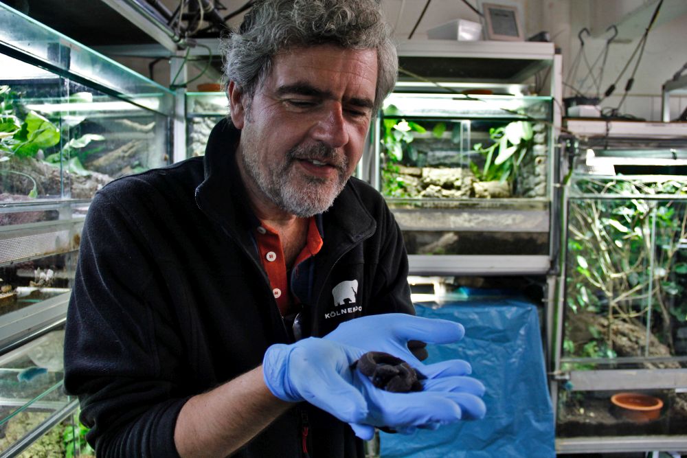 Gestapelte Plastikbehälter und Terrarien, Kabel und Rohre an der Decke, künstliches Licht und herumliegende Pipetten – wenig erinnert hier an die oberirdischen Ausstellungsräume des Kölner Aquariums, gegenüber dem Haupteingang vom Kölner Zoo. Thomas Ziegler, Professor für Zoologie, steht im Keller des Gebäudes und legt sich vorsichtig zwei Vietnamesische Krokodilmolche auf die Hand. Fast zärtlich betrachtet er die schwarzen Jungtiere.