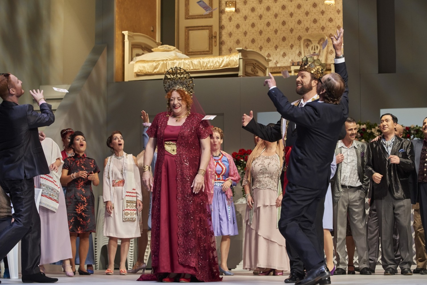 In der Tat sind es alte russische Hochzeitsrituale, mit denen sich Igor Strawinsky um die 1920er Jahre herum beschäftigt hatte, bevor er seine Tanzkantate – eine Mischform von Ballett und Oper – „Les Noces“ komponierte. Und in der Tat geht es um einen weitverzweigten Familienclan: Auf der Wuppertaler Opernbühne ist es kein Geringerer als der antike Sagenkönig Ödipus, der mit seiner Iokaste die christlich-orthodoxe Vermählung feiert. Das hat der Komponist in seinem selbstgeschriebenen Libretto so nicht vorgesehen. Der Kunstgriff von Regisseur Timofey Kulyabin lässt das etwa halbstündige Kurzstück zum Prolog für Strawinskys weitaus bekannteres Opernoratorium „Oedipus Rex“ werden, das die Geschichte nach der Pause weitererzählt.