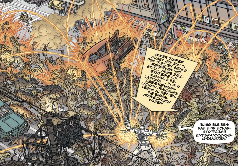 Den kompletten Irrsinn gibt es bei Frank Miller und Geoff Darrow. Anfang und Mitte der 90er Jahre haben sie sich für die Projekte „Hardboiled“ und „Big Guy and Rusty the Boy Robot“ zusammengetan. Wildeste Zerstörungsfantasien, die Darrow in seinen kleinteiligen Zeichnungen atemberaubend arrangiert, feiern die Konflikte zwischen Mensch, Maschine und Monster. In „Hardboiled“, das als Neuauflage erscheint, erkennt ein normaler Versicherungsvertreter bestürzt, dass er ein Androide ist. Das ultimative Godzilla-mäßige Schlachtenepos „Big Guy…“ erscheint erstmals auf Deutsch, ein aberwitziges Spektakel im Großformat (Cross Cult). Amazing Améziane widmet sich derweil auf über 200 Seiten exzessiv dem Werk von „Quentin Tarantino“ und bleibt dabei selber dramaturgisch, visuell und atmosphärisch dicht am Objekt seiner Untersuchung. Natürlich ist das nerdig hoch zehn, wenn zwei solche Film- und Comicfans aufeinandertreffen – aber eben auch genauso unterhaltsam (Splitter).